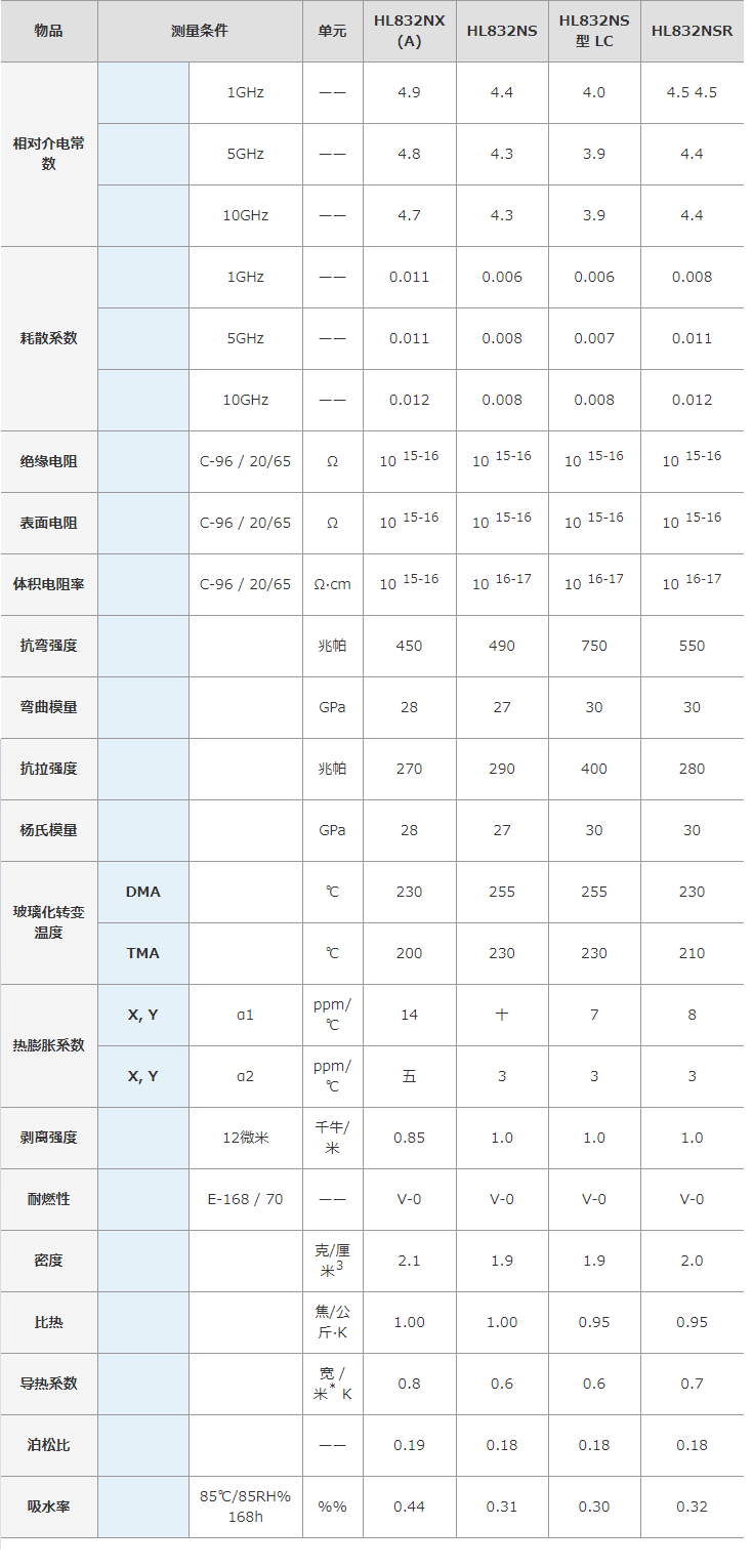 三菱瓦斯 HL832NXA IC封裝載板材料參數(shù)表